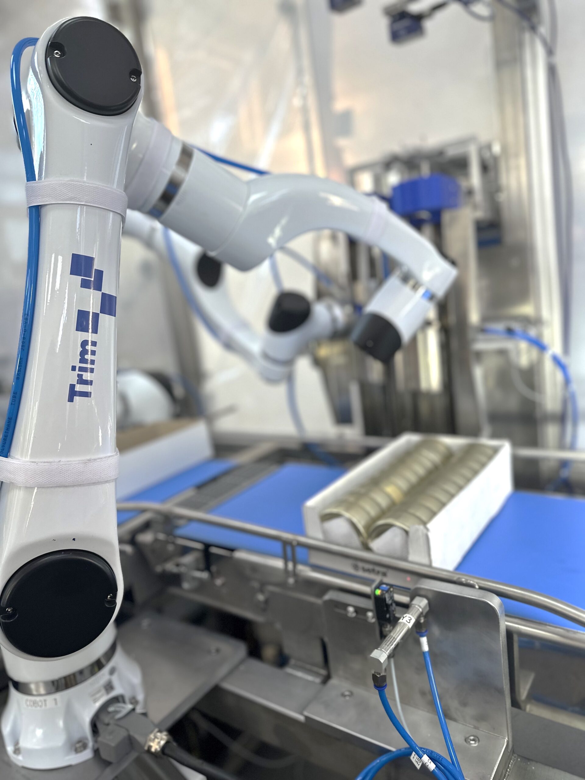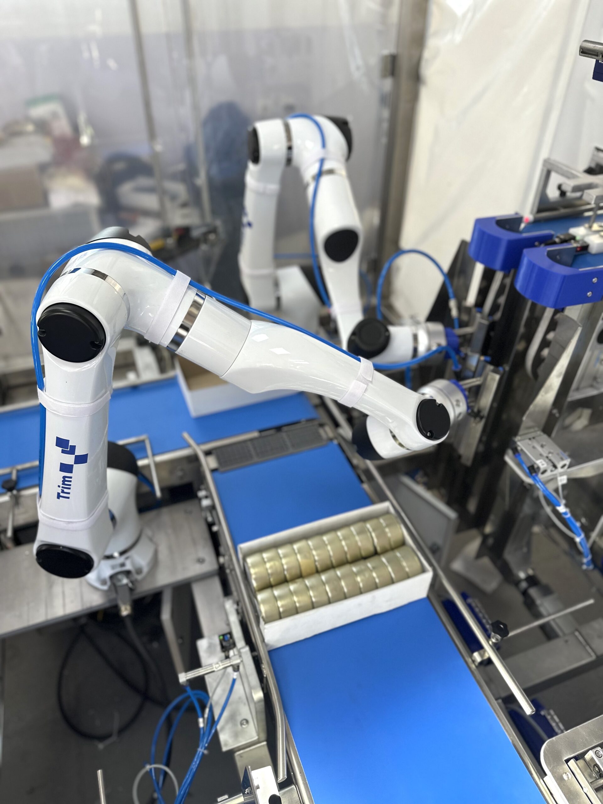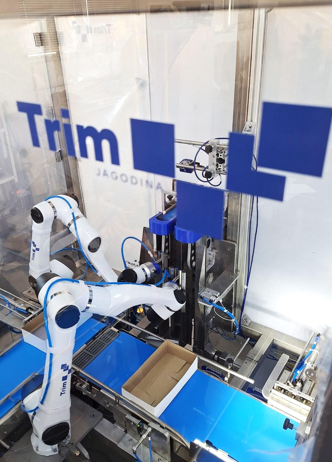 Trim je razvio rešenje TrimPack C200, koje objedinjuje tačno odbrojavanje pojedinačnih proizvoda i njihovo slaganje u formu spremnu za ubacivanje u kutiju sa inovativnom tehnologijom preuzimanja i pakovanja od strane dve kobot ruke. Kobot ruke rade sinhronizovano kako bi omogućile maksimalnu brzinu pakovanja.
